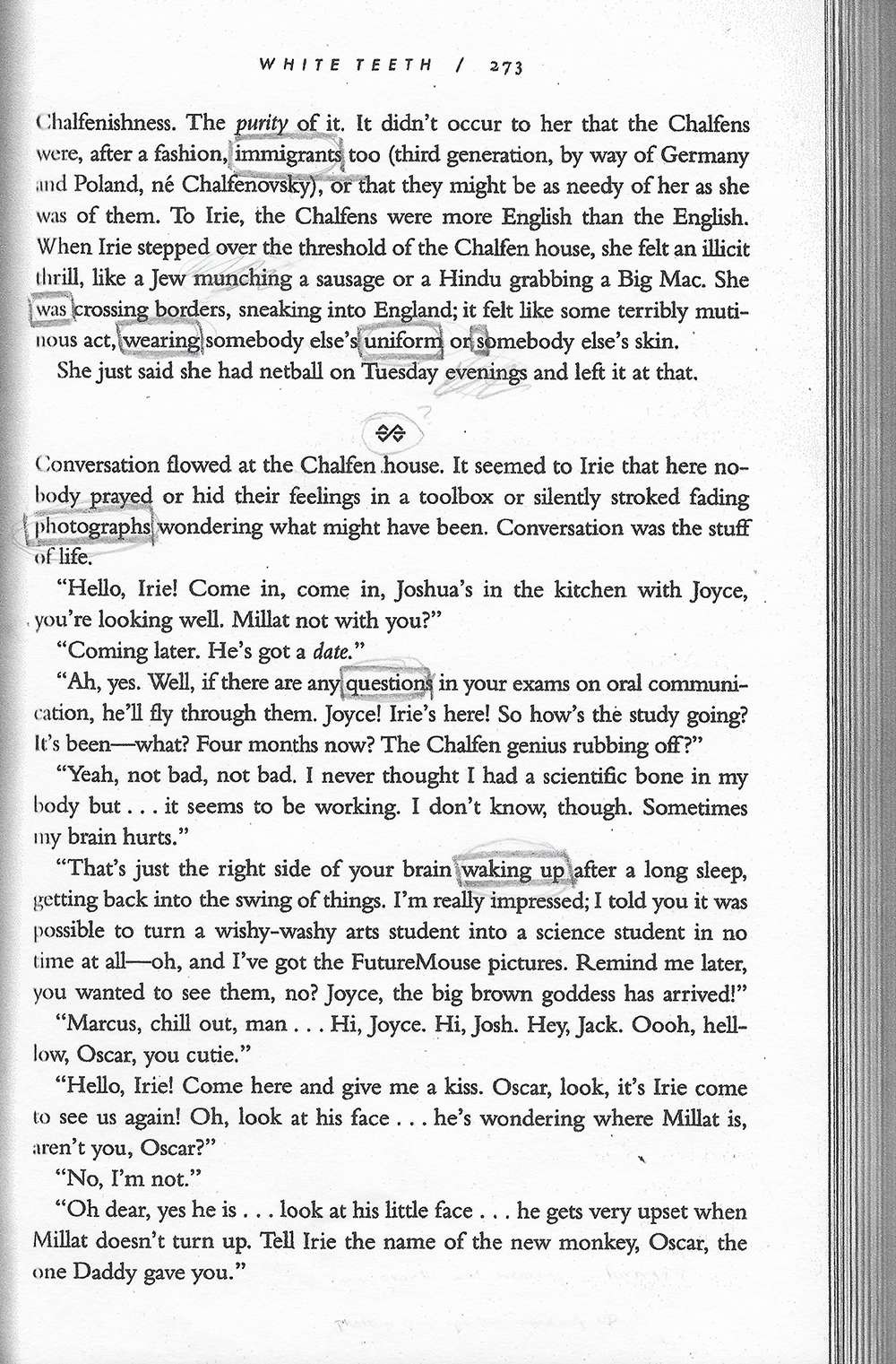 As for the text that I took my words from, I was trying to find a book that I had more of a personal connection to, but that seemed to be too much for my brain to process so I ended up just choosing the most recent book I finished, White Teeth by Zadie Smith. It was one of my better summer reading books and had a lot of serious themes despite the weirdness of the overall plot. The story focuses a lot on finding your identity and traditional vs. old beliefs.